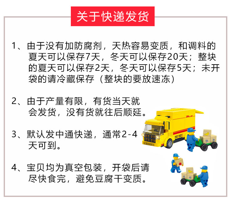 亲爱的吃货们,由于本店豆腐干未添加防腐剂,天热易变质,为保证到货质量和口感,故每年4月初到10月初快递需要时间较长或者炎热的地区一律不发货,给各位亲带来不便,敬请谅解!