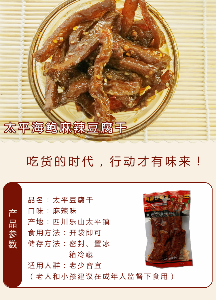 四川乐山太平豆腐干是乐山当地的特色名小吃,其中以海鲍豆腐干尤为出名,其豆腐干精选优质大豆,加入秘制卤料,采用传统工艺制作而成, 为了追求口感没有加防腐剂,成品卤香味足,鲜香可口,深受食客喜爱。凭借良心的用材,出色的味道,海鲍豆腐干先后受到央视《生财有道》、《舌尖上的中国》等栏目的特别报道,享誉省内外。